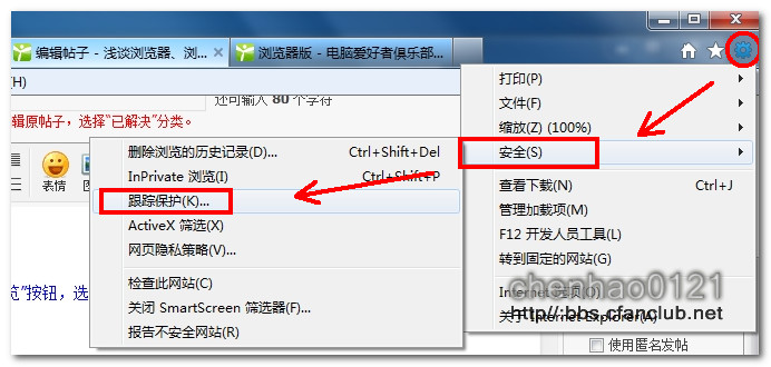 单击IE9右上角的“工具”图标,再单击“安全性”,最后再单击“跟踪保护”。